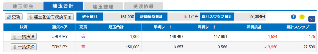 現在、セントラル短資の口座では、スワップ系(TRY/JPY)を中心に運用しています。