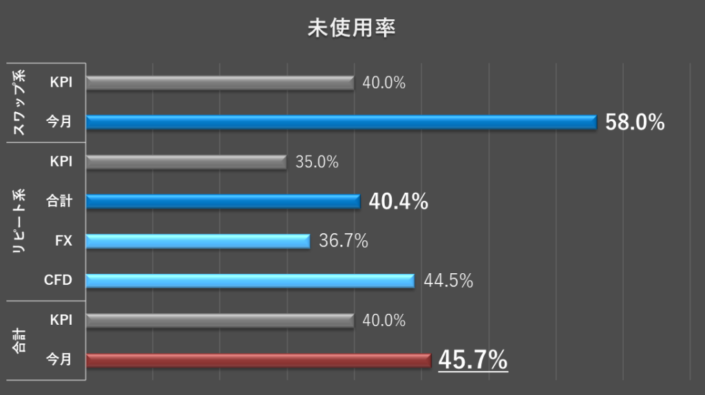 - 未使用率:合計・スワップ系は40%以上、リピート系(FX・CFD)は共に35%以上とKPIを達成(安定期)