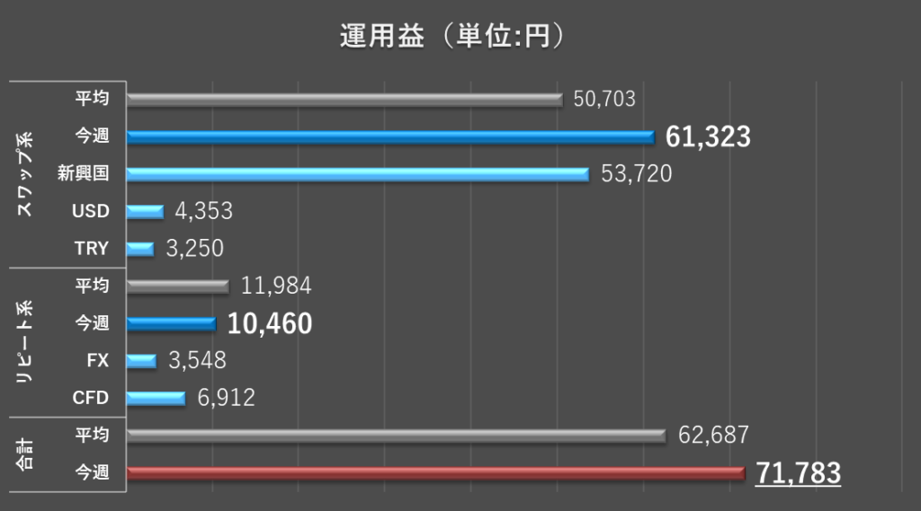 今週のスワップ系とリピート系の合計運用益は71,783円となり、過去3番目の好成績でした。