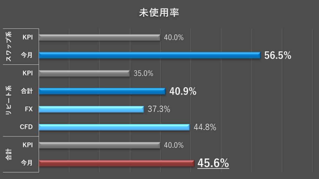 - 未使用率:合計・スワップ系は40%以上、リピート系(FX・CFD)は共に35%以上とKPIを達成(安定期)