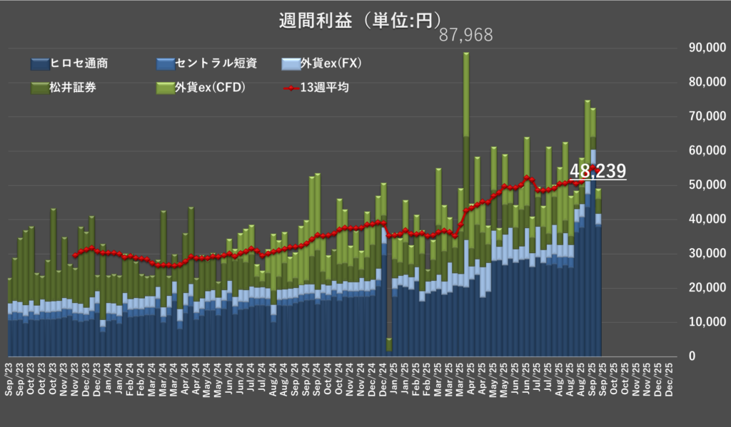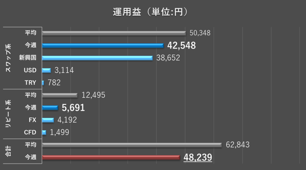 今週の合計運用益は48,239円となり、目安レンジ(38,000~50,000円*)内に収まる結果となりました。