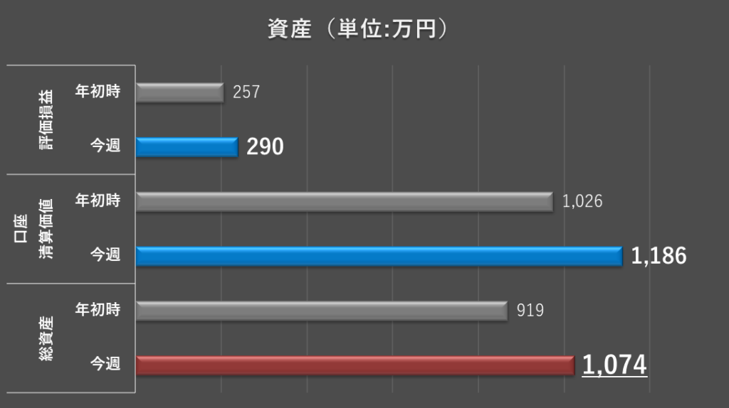 評価損益・口座清算価値・総資産について確認します。ある程度長期的な視点で確認するため、2025年初時点との比較を行います(カッコ内は前週実績)。