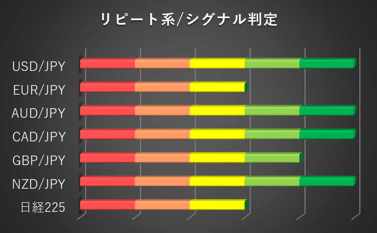 - リピート系:EUR/JPY、日経225のシグナル判定は評価3、それ以外は評価4以上(減速期)