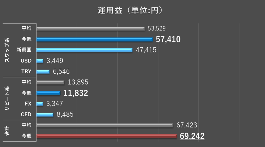 今週の合計運用益は69,242円となり、過去最高益を記録しました。目安レンジ(39,000~51,000円*)を大きく上回る結果となりました。