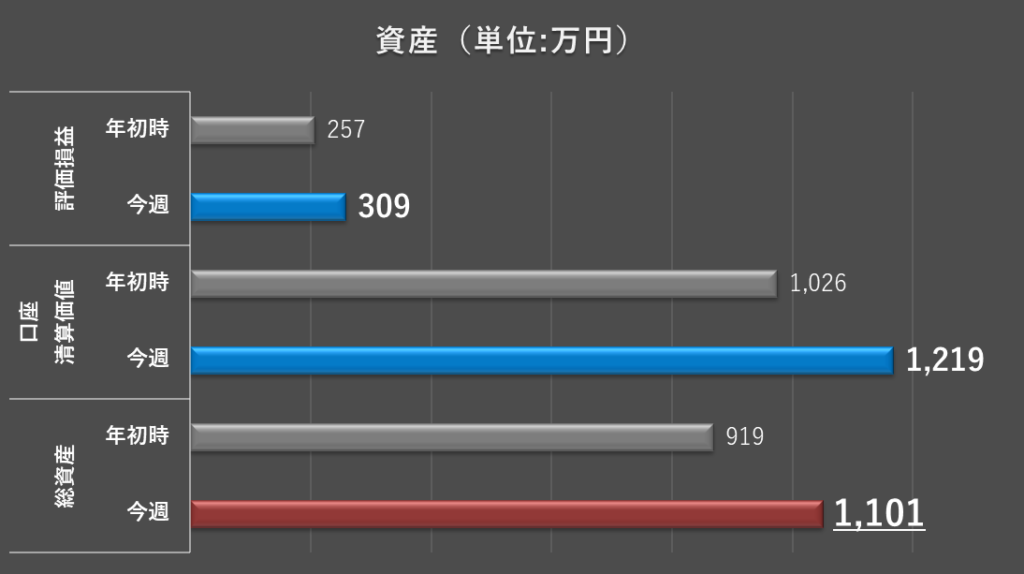 資産の推移は、週次の利益以上に「運用の安定性」や「積み上げの実感」を得るうえで大切な指標です。ここでは、評価損益・口座清算価値・総資産の3項目を確認していきます(カッコ内は前週実績)。