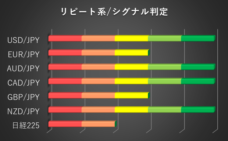 このため、リピート系の各取引において為替レート/日経225の株価の状態を5段階評価(シグナル判定)で確認します。