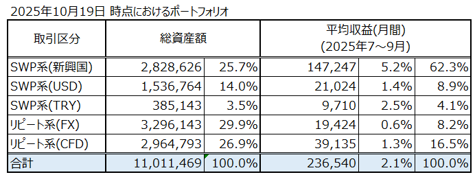 まずは、2025年10月19日時点における資産ポートフォリオを確認します。収益は、2025年7〜9月の1ヶ月あたりの平均額を基準としています。