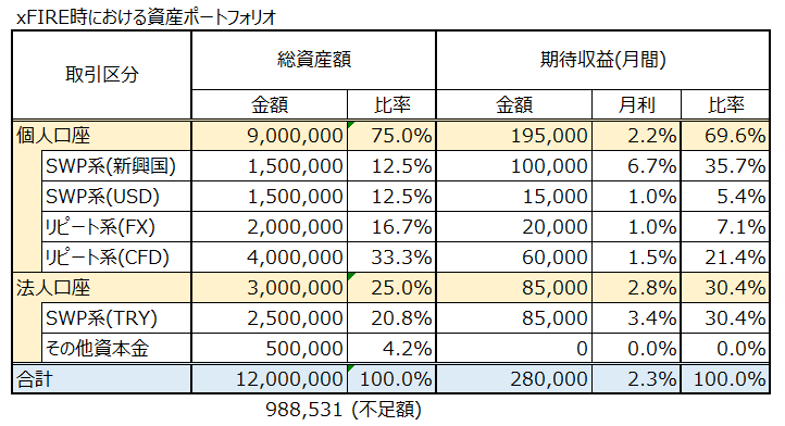 因みに上記の内、スワップ系のポートフォリオを現時点とxFIRE後の目標値と比較してみると以下になります。