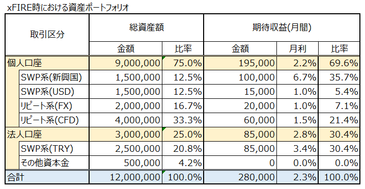 このうち、スワップ系で25万円を安定的に確保できれば、リピート系で月5万円以上の収益が見込めるため、積極的な資産拡大フェーズは一旦完了と判断することができます。