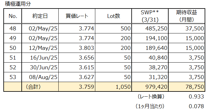 スワップ系の総資産額 485万円に対し、月利換算のスワップ率は5.0%に達しています(目標KPI:2.0〜3.0%)。