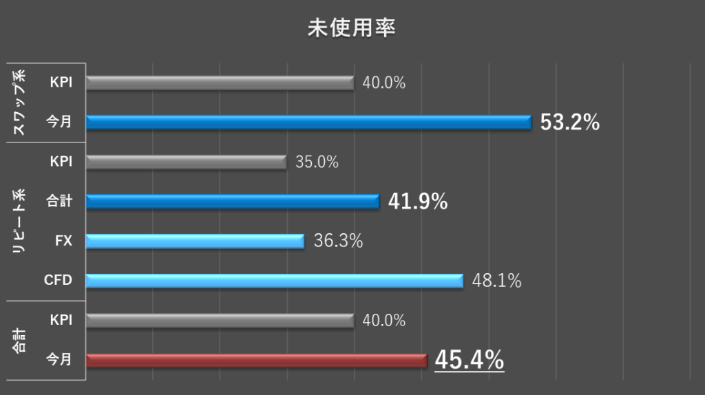 - 未使用率:合計・スワップ系は40%以上、リピート系(FX・CFD)は共に35%以上とKPIを達成(安定期)