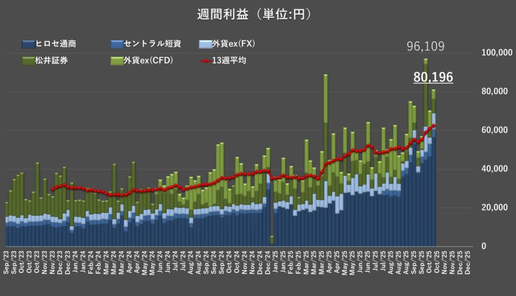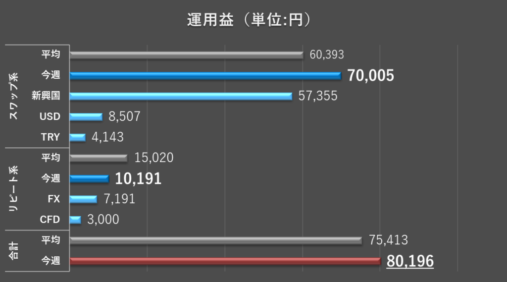 今週の合計運用益は80,196円。過去3番目の高記録で、目安レンジ(39,000~52,000円*)も大きく上回りました。