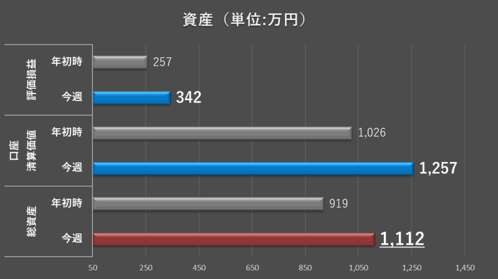 資産の推移は、週次の利益以上に「運用の安定性」や「積み上げの実感」を得るうえで大切な指標です。ここでは、評価損益・口座清算価値・総資産の3項目を確認していきます(カッコ内は前週実績)。