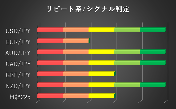 - リピート系:EUR/JPYは評価2、GBP/JPY、日経225は評価3、それ以外は評価4以上(要対策期)