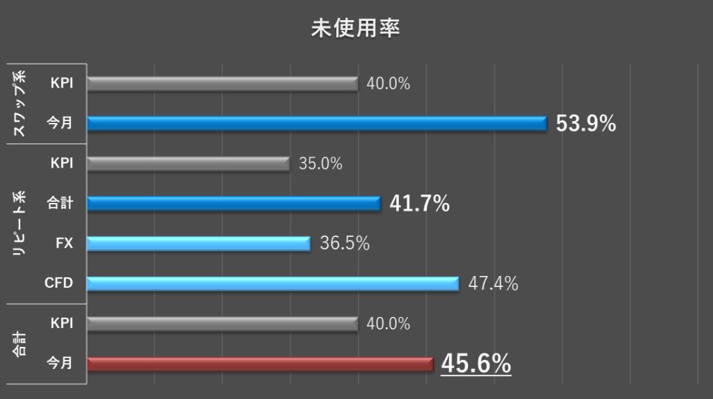- 未使用率:合計・スワップ系は40%以上、リピート系(FX・CFD)は共に35%以上とKPIを達成(安定期)