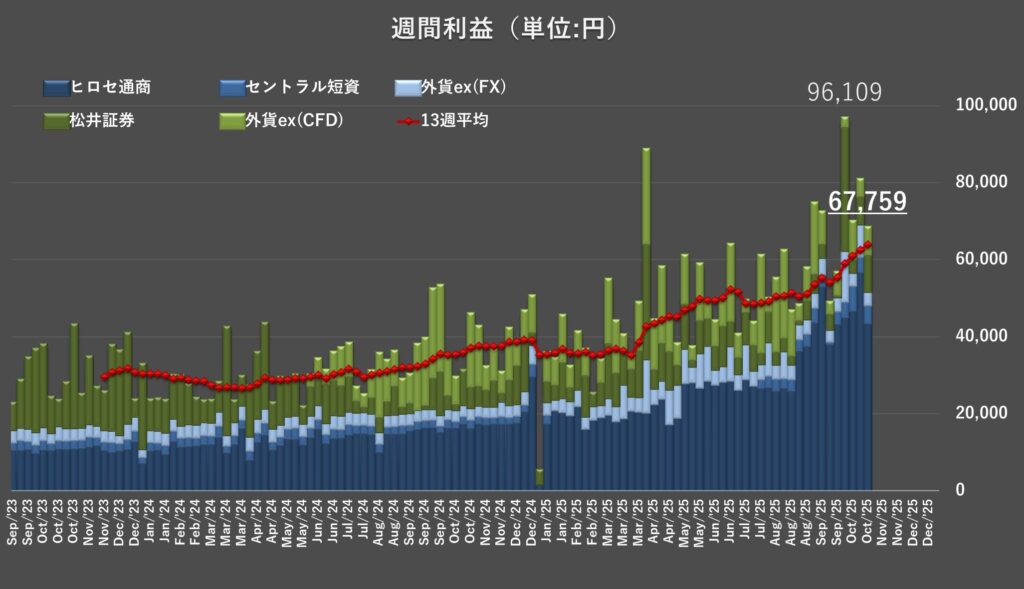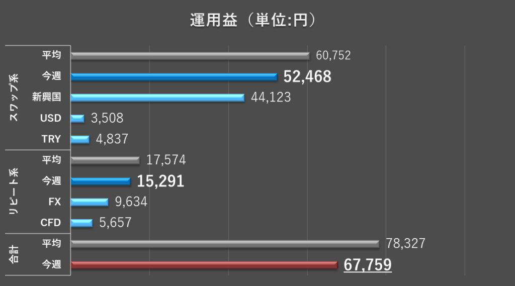 今週の合計運用益は67,759円となり、今週も目安レンジ(39,000~52,000円*)を大きく上回りました。