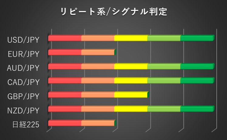 このため、リピート系の各取引において為替レート/日経225の株価の状態を5段階評価(シグナル判定)で確認します。