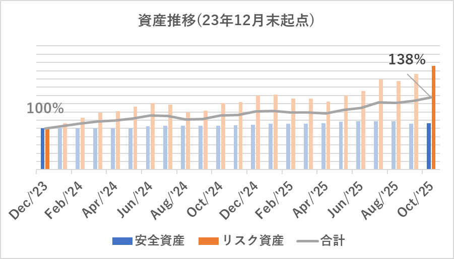 今月もリスク資産が10%近く増加しました。結果として資産合計も138%と先月より5%程増加しました。