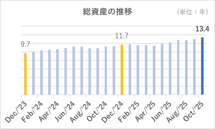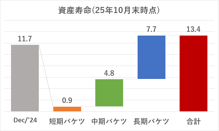 先月の合計は12.9年でしたので、この1ヶ月で0.5年程増加したことになります。24年末と比べて1.4年の増加となります。