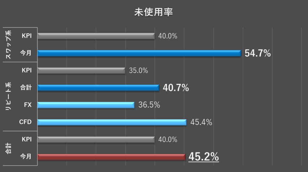 - 未使用率:合計・スワップ系は40%以上、リピート系(FX・CFD)は共に35%以上とKPIを達成(安定期)
