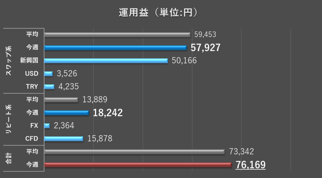 今週の合計運用益は76,1659円となり、今週も目安レンジ(39,000~53,000円*)を大きく上回りました。