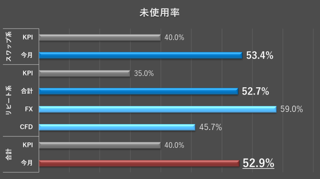 - 未使用率:合計・スワップ系は40%以上、リピート系(FX・CFD)は共に35%以上とKPIを達成(安定期)
