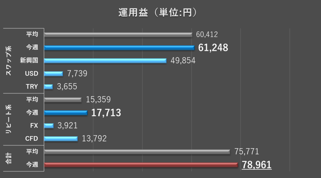 今週の合計運用益は78,961円となり、今週も目安レンジ(40,000~53,000円*)を大きく上回りました。