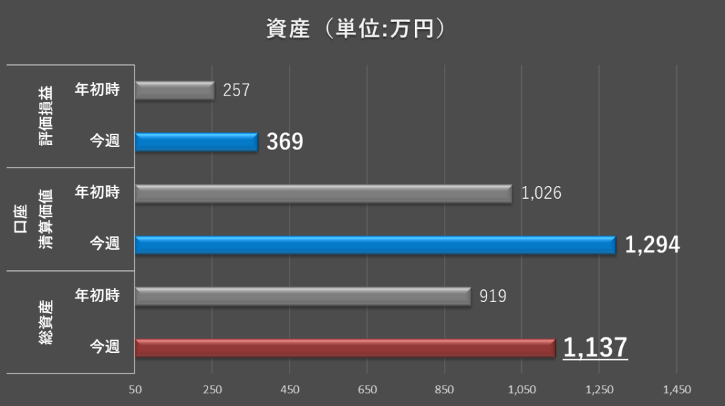 資産の推移は、週次の利益以上に「運用の安定性」や「積み上げの実感」を得るうえで大切な指標です。ここでは、評価損益・口座清算価値・総資産の3項目を確認していきます(カッコ内は前週実績)。
