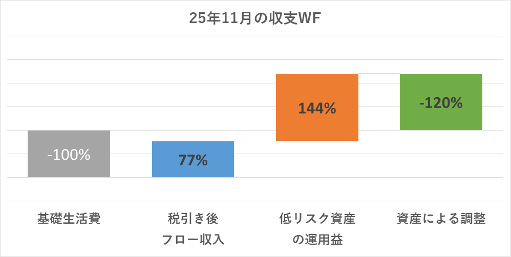というわけで、今回は『バケツ戦略の検証として、25年11月の基礎生活費における資産のカバー状況』について報告します。