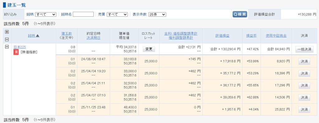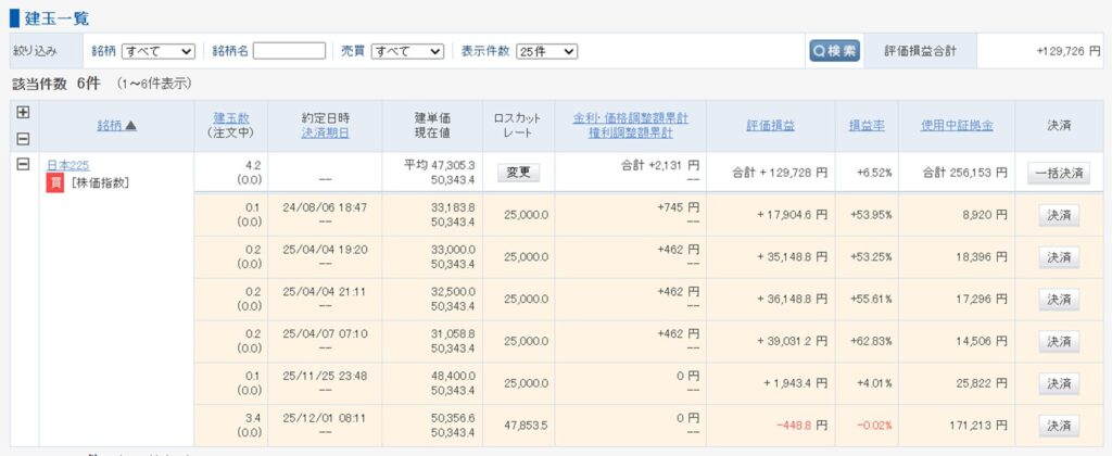 | 25年12月 | GMO外貨 (外貨ex CFD) | 日本225 | 3.8枚 | 33,354円 |