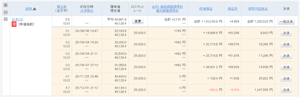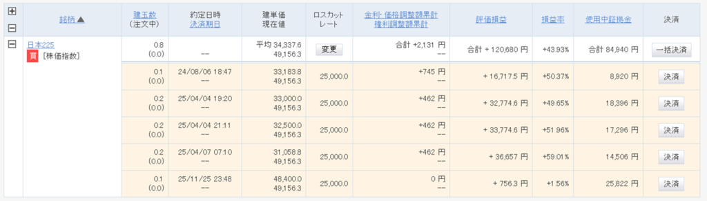 | 25年12月 | GMO外貨 (外貨ex CFD) | 日本225 | 4.7枚 | 47,442円 |