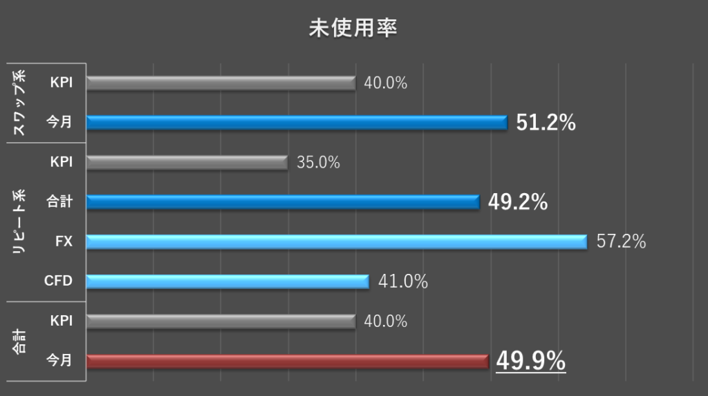 - 未使用率:合計・スワップ系は40%以上、リピート系(FX・CFD)は共に35%以上とKPIを達成(安定期)