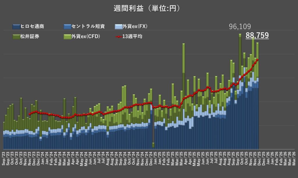 最後に、週間利益の推移を確認します。各口座の実績を棒グラフ、直近13週の平均は折れ線で示しています。