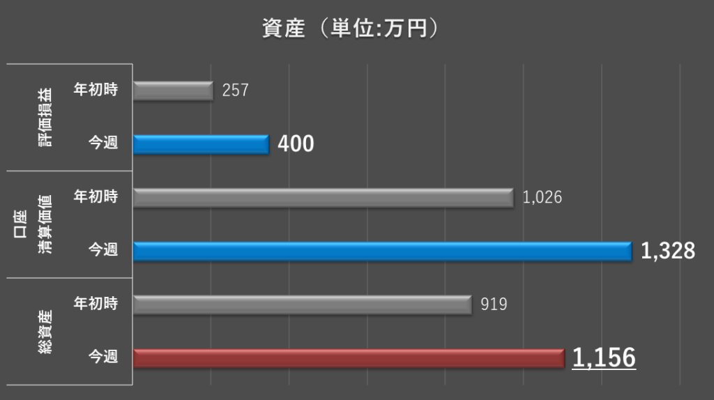 資産の推移は、週次の利益以上に「運用の安定性」や「積み上げの実感」を得るうえで大切な指標です。ここでは、評価損益・口座清算価値・総資産の3項目を確認していきます(カッコ内は前週実績)。