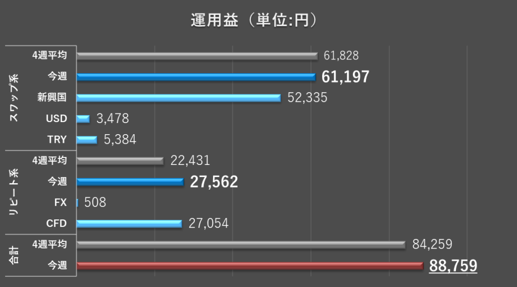 今週の合計運用益は88,759円となりました。リピート系(FX)をUSD/JPY単独設定に変更しましたが、今週も1回しか決済しませんでした。来週に期待したいです。