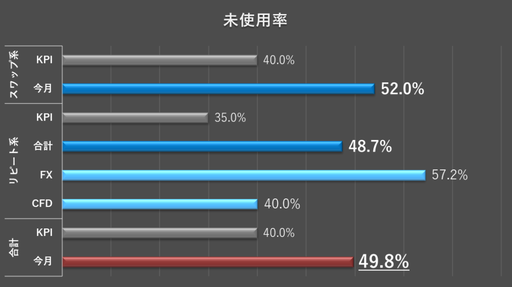 - 未使用率:合計・スワップ系は40%以上、リピート系(FX・CFD)は共に35%以上とKPIを達成(安定期)