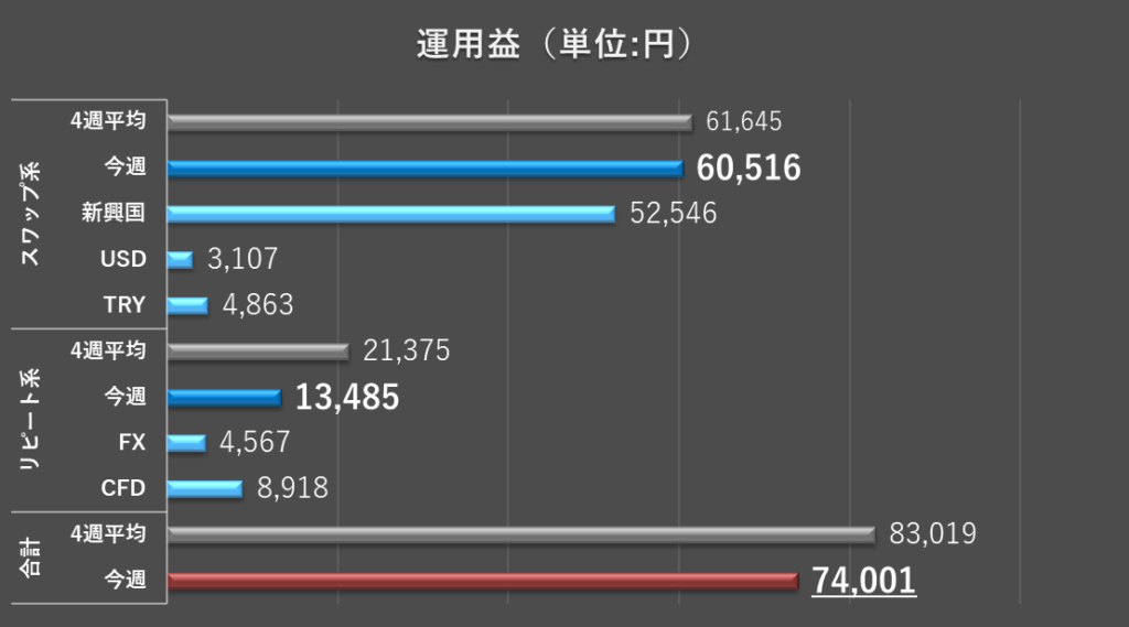 今週の合計運用益は74,001円となりました。ようやくリピート系(FX)の新設定である、USD/JPY単独通貨取引仕様が複数回決済しました。今後の推移をもう少し見守りたいと思います。
