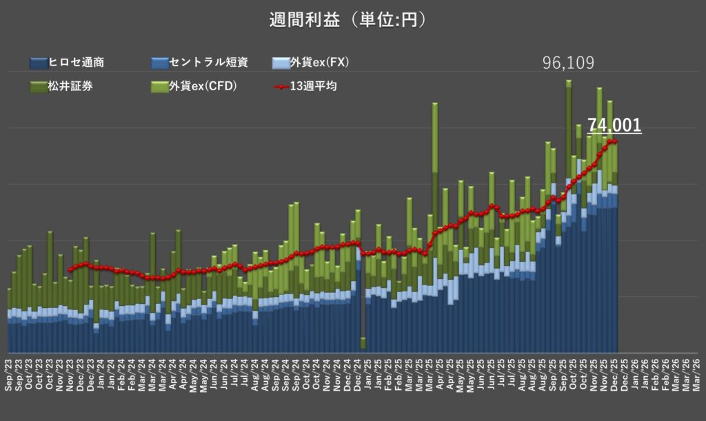 最後に、週間利益の推移を確認します。各口座の実績を棒グラフ、直近13週の平均は折れ線で示しています。