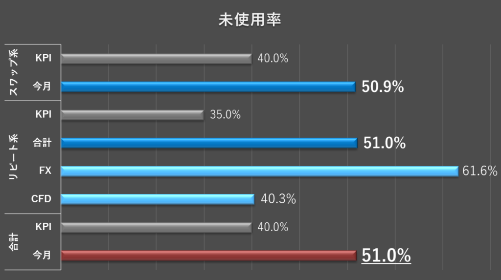 - 未使用率:合計・スワップ系は40%以上、リピート系(FX・CFD)は共に35%以上とKPIを達成(安定期)
