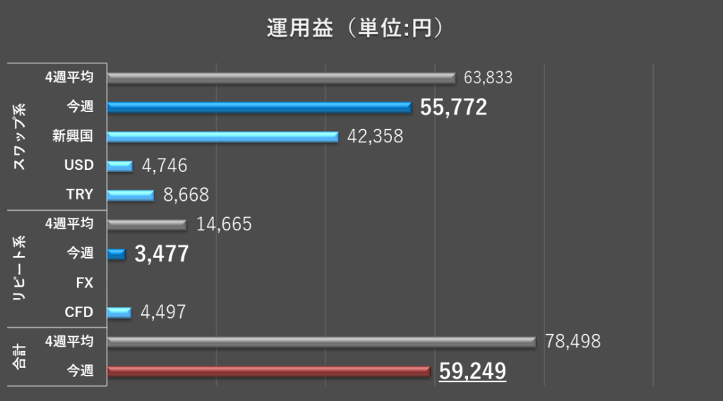 今週の合計運用益は59,249円となりました。リピート系(FX)の設定を元の設定に戻した関係上、既存建玉の清算をした分がマイナス計上されています。