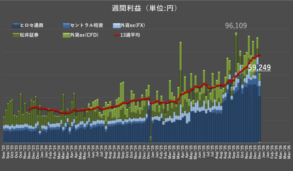 最後に、週間利益の推移を確認します。各口座の実績を棒グラフ、直近13週の平均は折れ線で示しています。