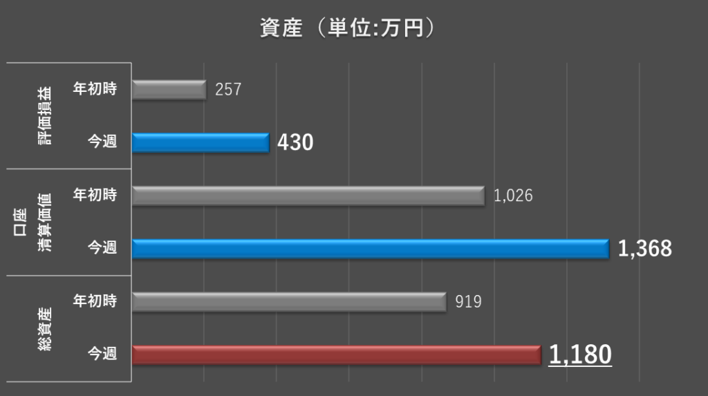 資産の推移は、週次の利益以上に「運用の安定性」や「積み上げの実感」を得るうえで大切な指標です。ここでは、評価損益・口座清算価値・総資産の3項目を確認していきます(カッコ内は前週実績)。