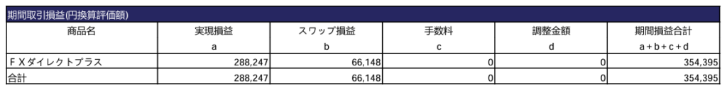 まずは取引内容となります。年初時に保有していたMXN/JPYのポジションを整理したことによる実現損益とスワップポイントの合計で354,395円となりました。