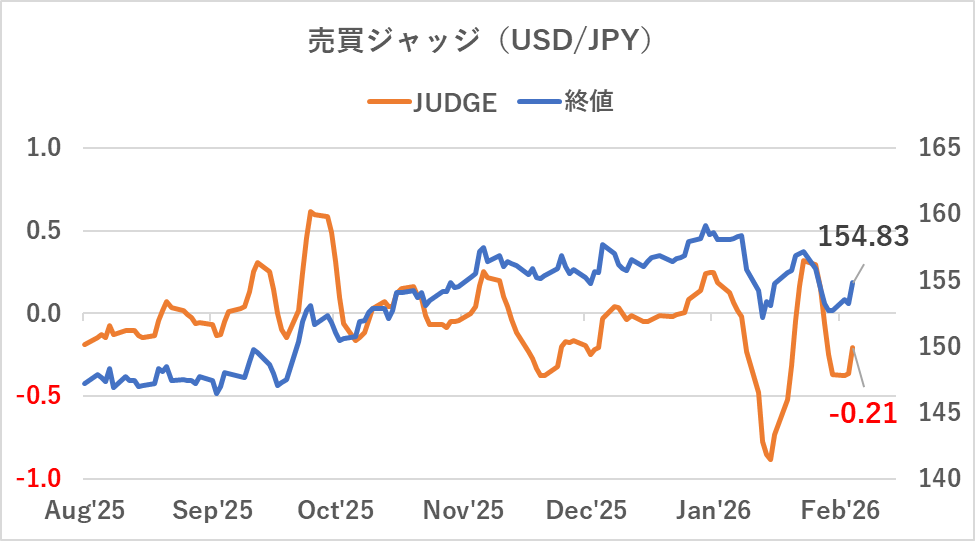 USD/JPY:2月11日時点でマイナスに転換(▲0.06)。