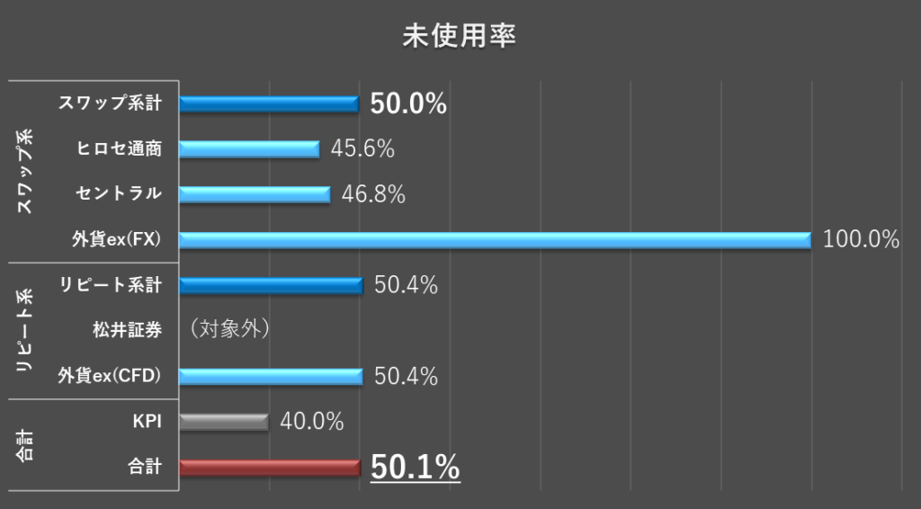 *注2:外貨ex(CFD)に関しては、資金の一部を使って為替王さんの『日経リピートCFD』に基づいた取引(以下、積極運用)を実践しているため、未使用率KPIは設定していません。その部分を除いた従来通りの取引については、これまで通り未使用率KPIを設定しています。
