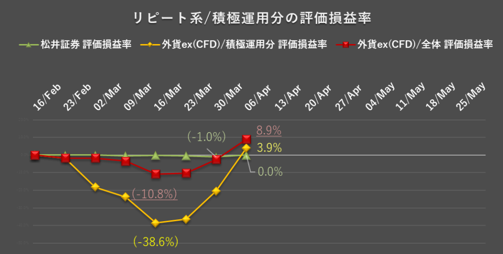 外貨ex(CFD)の積極運用部分に関して、評価益がプラスに転じて、3.9%(7.7万円)となりました。一方、通常運用部分も合わせた全体での評価損は、安値圏で仕込んでおいた建玉の含み益が加算され、8.9%(53.4万円)となっています。