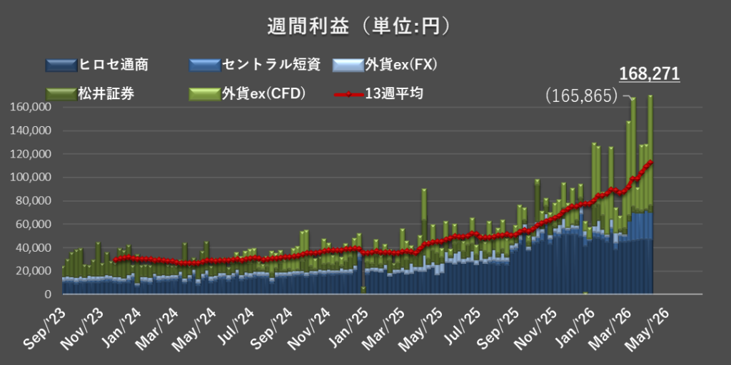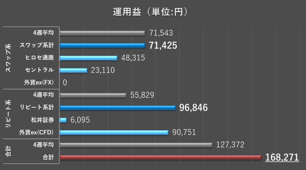 今週の合計運用益は168,271円と、過去最高益の更新となりました。さらに、今週は目安レンジ(65,000~97,000円*)を大きく上回る結果となりました。
