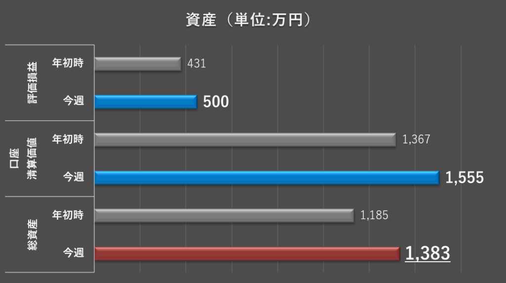 今週は、評価損益、口座清算価値、総資産のすべてにおいて、過去最高額更新となりました。この結果に慢心することなく、取引方針に則り冷静に取引していきたいと思います。