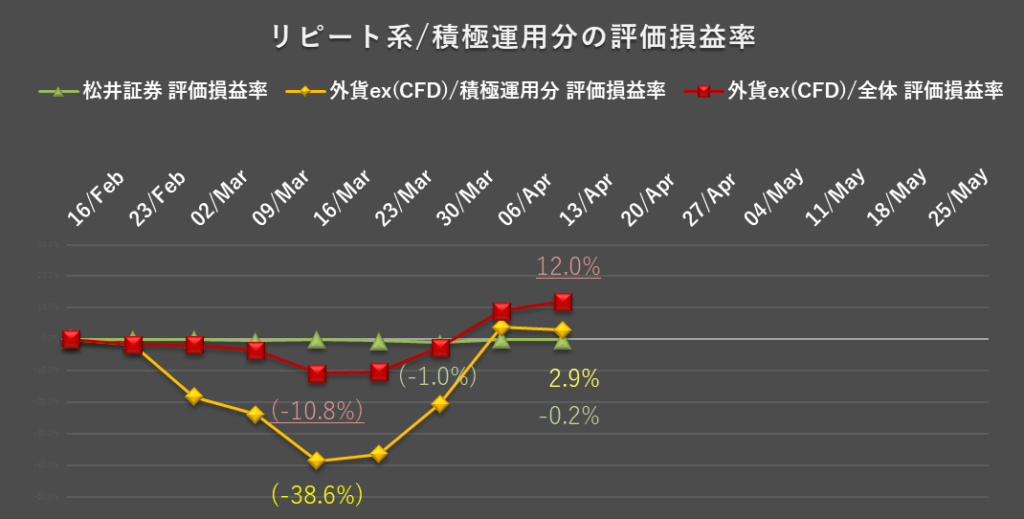 外貨ex(CFD)の積極運用部分に関して、今週も評価益はプラスで、2.9%(5.8万円)となりました。一方、通常運用部分も合わせた全体での評価損は、安値圏で仕込んでおいた建玉の含み益が加算され、12.0%(72.9万円)となっています。