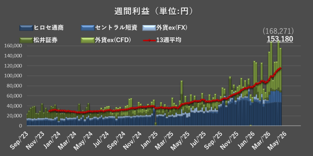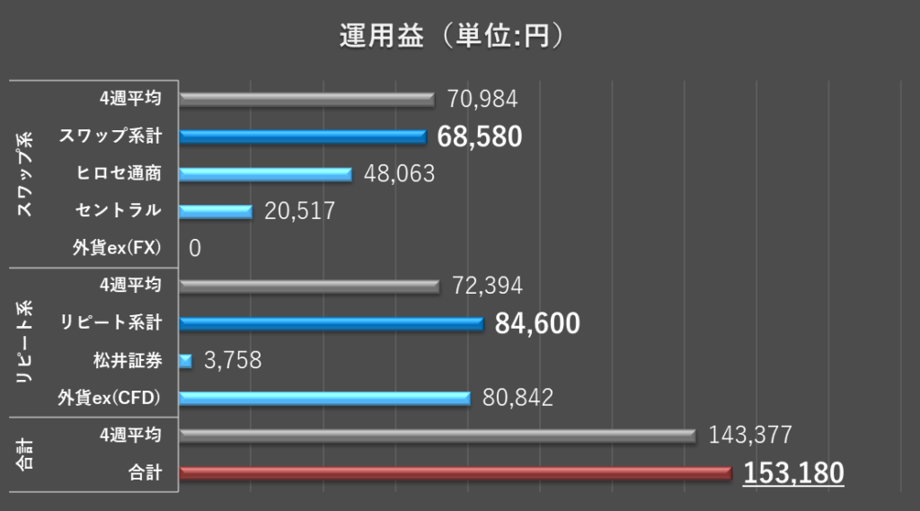今週の合計運用益は、153,180円となりました。過去3番目の高収益です。今週も目安レンジ(65,000~98,000円*)を大きく上回る結果となりました。
